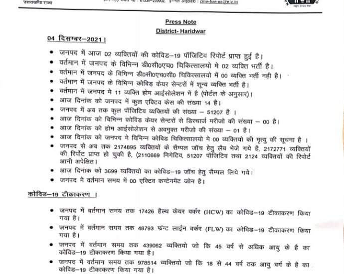 कोरोना न्यूज : जनपद हरिद्वार में आज कोरोना का 01संक्रमित मरीज मिला और 01 मरीज स्वस्थ हुआ