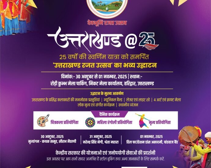 ब्लॉक स्तरीय युवा महोत्सव का सफल आयोजन हरिद्वार, 30 अक्टूबर, 2025: क्षेत्रीय युवा कल्याण एवं प्रांतीय रक्षक दल अधिकारी, बहादराबाद ने बताया कि वित्तीय वर्ष 2025-26 में विकासखंड-बहादराबाद में ब्लॉक स्तरीय युवा महोत्सव का सफल आयोजन उत्तराखंड संस्कृत विश्वविद्यालय, बहादराबाद में किया गया। इस महोत्सव में लोकनृत्य (सामूहिक), लोकगीत (सामूहिक),Continue Reading