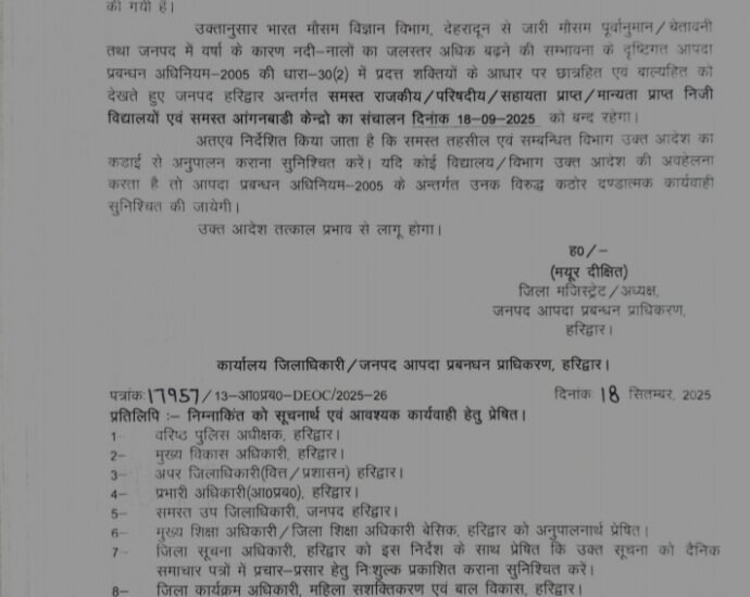 जिलाधिकारी मयूर दीक्षित ने आज हरिद्वार के अपर रोड स्थित राजकीय प्राथमिक विद्यालय नं. 34 और 41 का औचक निरीक्षण किया। इस दौरान उन्होंने पाया कि दोनों स्कूल की इमारतें पुरानी और जर्जर हो चुकी हैं। छात्रों की सुरक्षा को ध्यान में रखते हुए, उन्होंने प्रधानाचार्य को कक्षाएं सुरक्षित स्थानोंContinue Reading