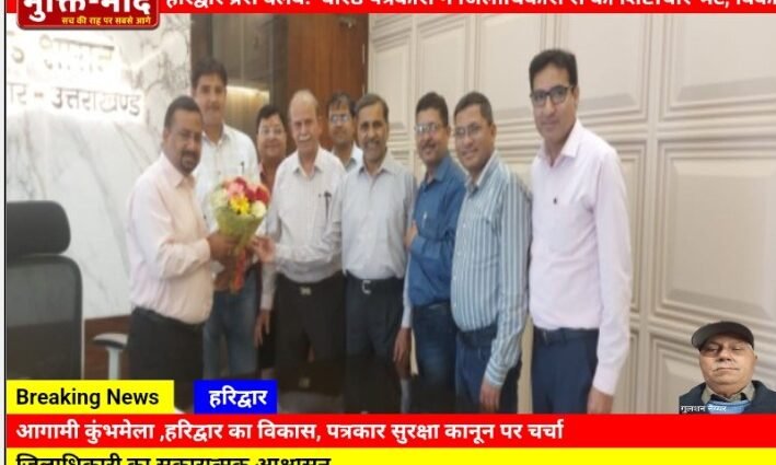 हरिद्वार: नवनियुक्त प्रेस क्लब अध्यक्ष धर्मेंद्र चौधरी, महामंत्री दीपक मिश्रा और प्रेस क्लब के वरिष्ठ पत्रकारों के एक प्रतिनिधिमंडल ने आज जिलाधिकारी कर्मेंद्र सिंह से शिष्टाचार भेंट की। इस मुलाकात के दौरान प्रतिनिधिमंडल ने जिलाधिकारी को पुष्पगुच्छ भेंट कर उनका स्वागत किया और हरिद्वार के विकास में पत्रकारों की महत्वपूर्ण भूमिका पर विस्तार से चर्चा की।