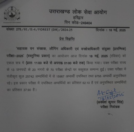 हरिद्वार: आज 18 मई, 2025 (रविवार) को सहायक वन संरक्षक, लॉयिंग अधिकारी एवं वनक्षेत्राधिकारी संयुक्त (प्रारंभिक) परीक्षा-2025 सफलतापूर्वक आयोजित की गई। यह परीक्षा एकल सत्र में प्रातः 11:00 बजे से अपराह्न 01:00 बजे तक चली।