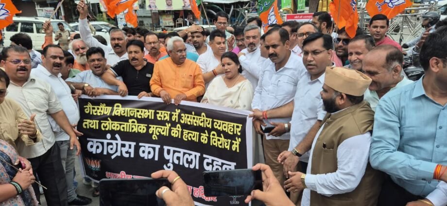 हरिद्वार: भाजपा कार्यकर्ताओं ने शुक्रवार को चंद्राचार्य चौक पर कांग्रेस का पुतला जलाकर विरोध प्रदर्शन किया। यह विरोध गैरसैंण में विधानसभा सत्र के दौरान कांग्रेस विधायकों के कथित अमर्यादित व्यवहार और हंगामा करने के विरोध में था।