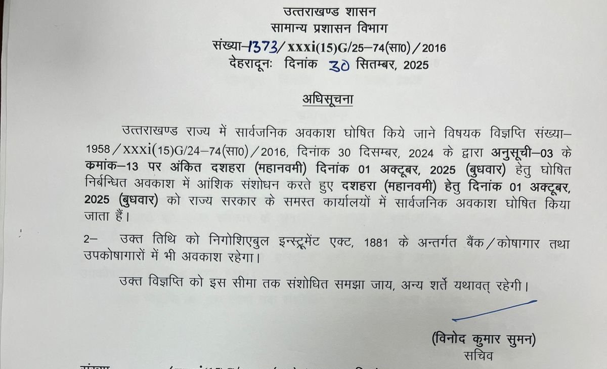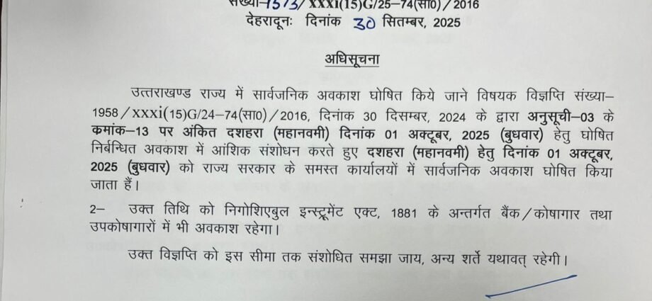 देहरादून: उत्तराखण्ड शासन ने दशहरा (महानवमी) के अवसर पर 01 अक्टूबर, 2025 (बुधवार) को राज्य के समस्त सरकारी कार्यालयों में सार्वजनिक अवकाश घोषित कर दिया है। यह अवकाश पहले निर्बन्धित अवकाश (Restricted Holiday) की श्रेणी में था, जिसे अब संशोधित करते हुए सार्वजनिक अवकाश (Public Holiday) किया गया है।