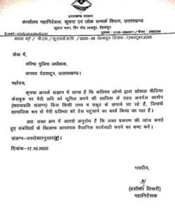 महानिदेशक बंशीधर तिवारी ने सोशल मीडिया प्लेटफॉर्म फेसबुक पर कुछ अज्ञात लोगों द्वारा उनकी छवि को धूमिल करने की साजिश के तहत “अनर्गल आरोप” लगाने के संबंध में वरिष्ठ पुलिस अधीक्षक (एसएसपी), देहरादून, उत्तराखंड से शिकायत की है।
