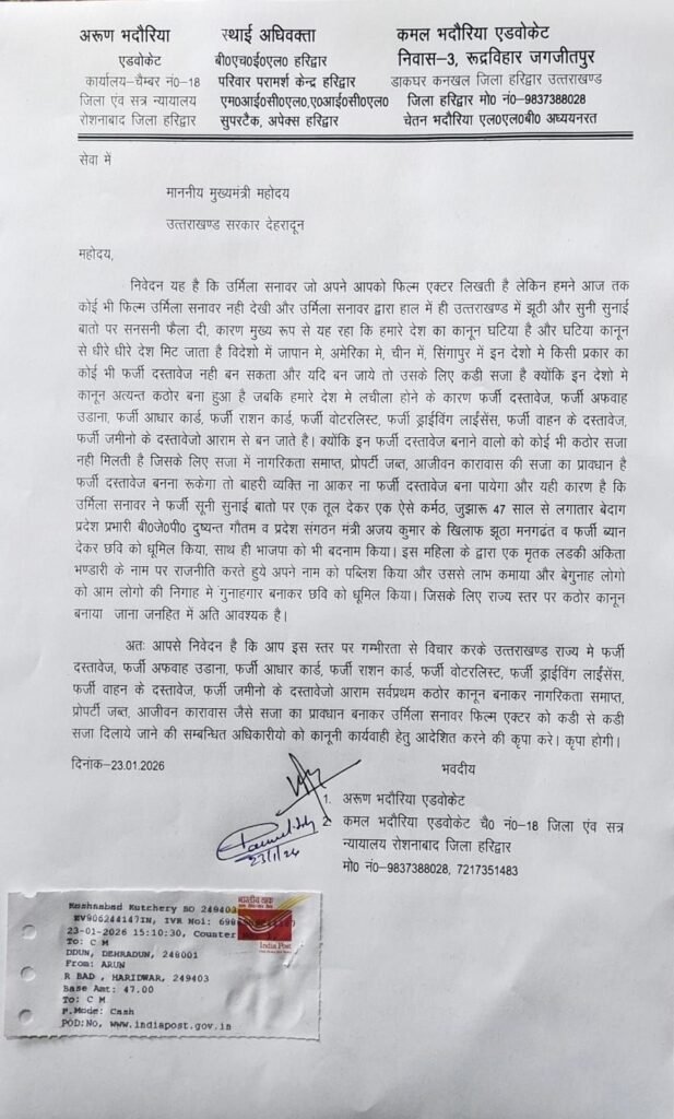 हरिद्वार: स्थानीय अधिवक्ताओं (अरुण भदौरिया एवं कमल भदौरिया) ने उत्तराखंड के मुख्यमंत्री को पत्र लिखकर प्रदेश में फर्जी दस्तावेज बनाने और अफवाह फैलाने वालों के विरुद्ध सख्त कानून बनाने की मांग की है।